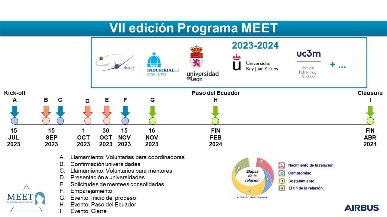 Las fechas tentativas del programa para este curso ya están definidas y las podéis encontrar en el archivo adjunto. Además de sesiones individualizadas con vuestro(a) mentor(a), las participantes estáis convocadas a tres sesiones grupales: lanzamiento (16 nov), paso del ecuador (fin feb 24) y evento de cierre (fin abr 24), donde podréis reforzar vuestra red y conocer a todo el equipo de mentores/as de Airbus y a otras participantes, tanto de la UPM como de otras universidades. El curso pasado el evento de cierre fue presencial e incluyó una visita a las plantas de Airbus en Getafe.
